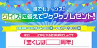 ![]() 【宝くじ】宝くじ70周年ワクワクキャンペーン 誰でもチャンス!クイズに答えてワクワクプレゼント! Aコース:ジャンボ宝くじのテレビCMにちょっとだけ出演できる権利(2名様) Bコース:70周年記念オリジナルQUOカード1000円券×2種(3000名様) WEBでも応募可能 クイズ: 宝くじは□□周年 クイズの答えと、郵便番号、住所、氏名(フリガナ)、性別、年齢、電話番号、ご希望のコースをご記入の上、市販のハガキで下記宛先までご応募下さい。 〒119-0216 日本郵便株式会社 銀座郵便局留 「クイズに答えてワクワクプレゼント!」事務局 |