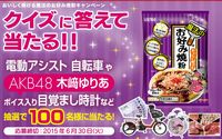 【昭和産業】おいしく焼ける魔法のお好み焼粉キャンペーンYAMAHA 電動アシスト自転車「PAS Kiss mini」(5名様) JCBギフトカード5000円分(65名様) AKB48木崎ゆりあ ボイス入り目覚まし時計(10名様) 厳選食材(20名様) WEBでも応募可能 クイズ:おいしく焼ける ○○○のお好み焼粉 ヒントはこちらのページをご覧ください 郵便ハガキに、郵便番号・住所・氏名・年齢・性別・電話番号・ご希望の賞品名・クイズの答えをご記入の上、下記の宛先にご応募ください。 〒225-8799 日本郵便株式会社 青葉郵便局留 昭和産業(株)「おいしく焼ける魔法のお好み焼粉キャンペーン」係 |