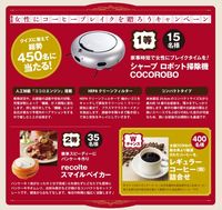 ![]() 【全日本コーヒー商工組合連合会】第5回 女性にコーヒーブレイクを贈ろうキャンペーン 1等:シャープ ロボット掃除機 COCOROBO(15名様) 2等:recolte スマイルベーカー(35名様) Wチャンス:レギュラーコーヒー詰め合わせ(400名様) WEBでも応募可能 クイズ: ○月1日はコーヒーの日 官製ハガキに郵便番号・ご住所・お名前・電話番号・年齢・性別・クイズの答えを明記の上、ご郵送ください 〒105-0003 東京都港区西新橋2-34-2 全日本コーヒー商工組合連合会 コーヒーブレイク係 |