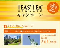 ![]() 【伊藤園】 TEAS'TEAキャンペーン クイズに答えて応募コース ニューヨーク旅行6日間(5組10名様) クイズ: TEAS'T○Aはニューヨーク生まれのティーブランドです。 クイズの答え、住所・氏名・性別・年齢・電話番号を明記のうえ応募 〒177-8691 日本郵便株式会社 石神井郵便局 私書箱75号 伊藤園「ティーズティーキャンペーン」係 【応募ハガキダウンロード/PDF】 |