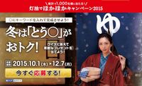 [ 2015/12/07 当日消印有効 ] 【石油連盟】灯油でほかほかキャンペーン2015Aコース:対流式石油ストーブ賞(4名様) Bコース:反射式石油ストーブ賞(15名様) Cコース:石油ファンヒーター賞(10名様) Dコース:グルメ賞(51名様) Wチャンス:QUOカード500円分(920名様) WEBでも応募可能 クイズ: 冬は「とう○」がおトク! 【応募ハガキダウンロード/PDF】 |