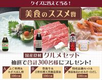![]() 【フンドーキン】調味料のススメキャンペーン A:ふぐ料理&カボスポン酢(100名様) B:豊後牛&吉野杉樽天然醸造醤油(100名様) C:特産品鍋セット&無添加あわせみそ・白だし(100名様) Wチャンス賞:フンドーキンドレッシングギフトセット(700名) WEBでも応募可能 クイズ:フンドーキン秋のキャンペーン名は ○○○のススメ アンケート:フンドーキン製品の中でお気に入りの調味料を教えて下さい 店頭備え付けの専用応募はがきか郵便はがき、またはホームページからクイズの答え、アンケート、希望商品、郵便番号、住所、氏名、年齢、性別、電話番号を明記の上、宛先までご応募ください 〒875-8612 大分県臼杵市大字臼杵501 フンドーキン醬油株式会社 調味料のススメキャンペーン事務局 行 【応募ハガキダウンロード/PDF】 |