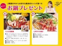 ![]() 【日本ガス石油機器工業会】 カセットこんろ買い替えおすすめキャンペーン 鍋食材セット(合計300名様) A:たらば海鮮鍋 B:上州牛すき焼き WEBでの応募も可能です。 クイズ:カセットこんろの買い替えは何年が目安? 〇年 専用ハガキまたは郵便ハガキに、クイズの答え、希望賞品コース、氏名(フリガナ)、郵便番号、住所、電話番号、年齢、性別を記入のうえご応募ください。 〒101-8691 日本郵便株式会社 神田郵便局 郵便私書箱 第133号 一般社団法人 日本ガス石油機器工業会 カセットこんろ買い替えおすすめキャンペーン 係 |